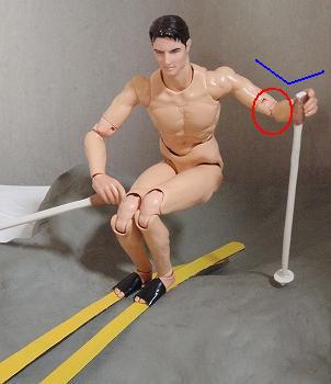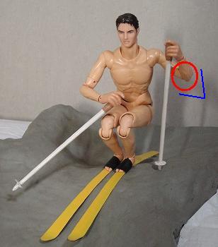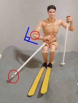 基礎スキーの場合、上体を斜面の下に向けておくためにフリーハンドは ↓ のように前に出し、スキーの向きと上体のひねりを作るために使うのが一般的です。また、フリーハンドを前に出すことにより、後傾を防止する働きもします。 モーグルの場合はスキーをあまり横に振らないので、基礎スキーのように上体のひねりを作るためにフリーハンドを前に伸ばすより、ストックの用意を早することを優先して、肘は曲げておいたほうがいいでしょう。