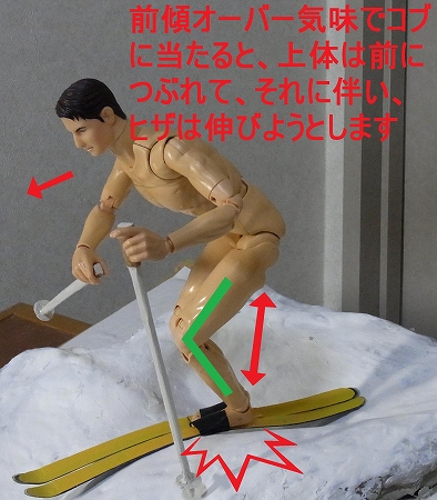 前傾オーバーでコブに当たると、上体は前につぶれます。それに伴いヒザの関節は伸びるように動きます。
