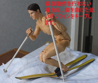 吸収動作を行わない場合は、脚を曲げた姿勢をキープして滑る。でも、疲れるのでやめた方がいいでしょう。(やっぱり吸収動作は大切です)