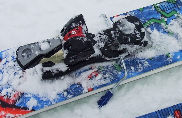 私の場合はと言いますと、サロモンの 130mmのワイドブレーキを力ずくで少し広げて、センター幅 141mmのこのスキーに装着しました。