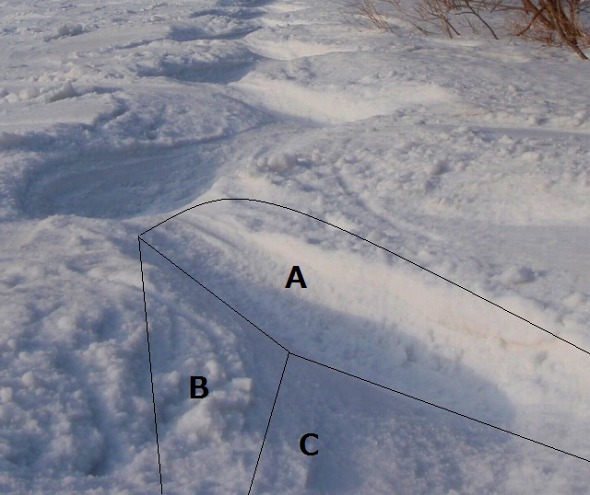 それは、Bの部分は C の方に向かって低くなっているため、スキーを横に向けようとしても、テールがひっかかってスキーを横に振れなくなってしまうからです。