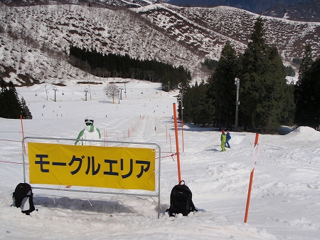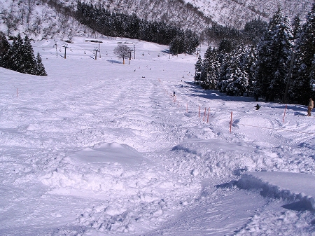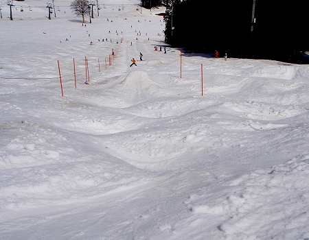 ここのコブ斜面、悪くはないのですが、他のスキー場のモーグルコースに比べ、デラがけすることが少なく、午後にはコブはかなり育ってしまっています。