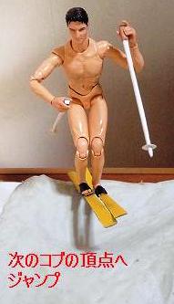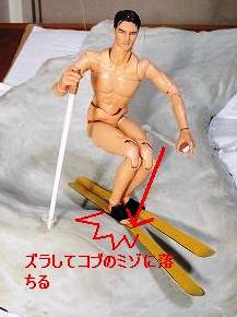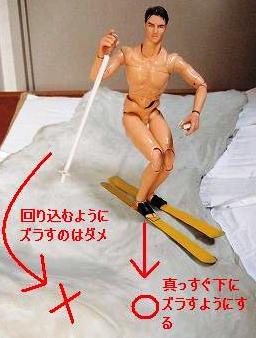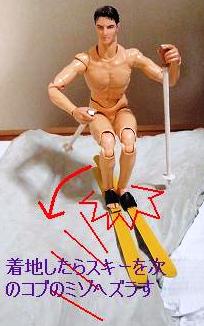 工夫2. ジャンプではスキーのトップを少し下げて、あたかもコブに接して滑っているように見せるのがポイントです。