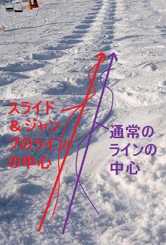 上記のように左ターンでズラシ、右ターンでジャンプする場合は、コブの滑走ラインの中心点が少し左側にずれることになります。