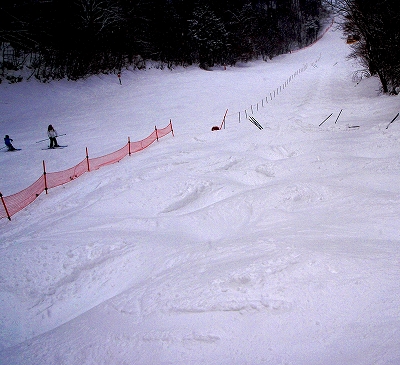 コブの形が縦で、さらにコブとコブの間隔が短いので、直線的に滑るモーグラーには適しているのですが、スキーを横に振る基礎スキーの滑り方では難易度の高いコブとなっています。